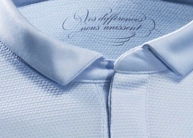 Além da inovadora cor azul clara, a camisa traz detalhes tricolores com as cores da bandeira francesa, azul, branca e vermelha que sugerem o patriotismo e orgulho francês.