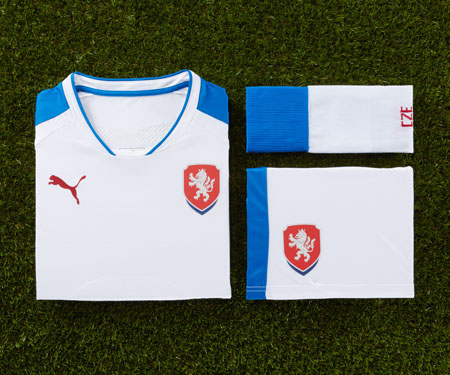 A camisa é predominantemente vermelha e traz formas em “V” descendo pelo manto em um tom mais claro. A camisa traz faixas neste tom mais claro nos ombros, com as logomarcas da Puma em branco. Este manto possui uma diferença dos demais que é o escudo da Federação Tcheca e da Puma centralizados.