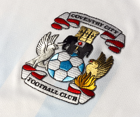 A Nike estampa uma versão preta de sua logomarca no lado direito do peito, enquanto o escudo do Coventry City FC é colocado no lado esquerdo, em sua versão tradicional.