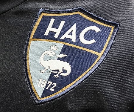 A Joma estampa uma versão azul marinha de sua logomarca no lado direito do peito, enquanto o novo escudo do Havre é colocado no lado esquerdo.