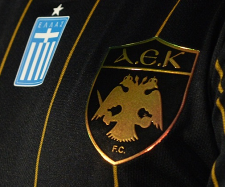 A Nike estampa uma versão preta de sua logomarca no lado direito do peito, enquanto o escudo do AEK é colocado no lado esquerdo, em uma versão dourada e preta.