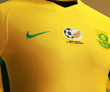A camisa titular da seleção sul-africana é predominantemente amarela e traz o mesmo modelo que a Nike utiliza em seus principais clubes e seleções.