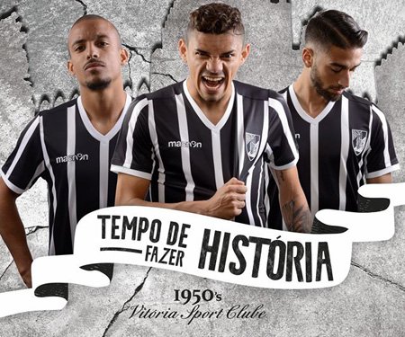 Com o mote “Tempo de fazer história”, o uniforme comemorativo ao kit utilizado na década de 50, traz a camisa preta com listras brancas na vertical.