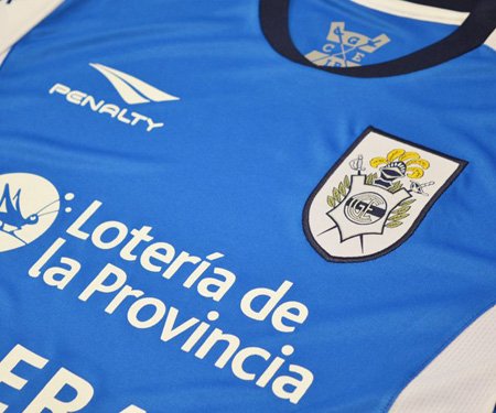 A Penalty estampa uma versão branca de sua logomarca no lado direito do peito, enquanto o escudo do Gimnasia Y Esgrima é colocado no lado esquerdo, em sua versão tradicional.