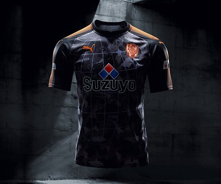 O manto titular do Shimizu S-Pulse tem a cor laranja como predominante e possui detalhes de camuflagem em amarelo, com a figura do mapa múndi em marca d’água, especificando exatamente os locais onde ficam a Ásia, Shimizu, Oceano Pacífico, Oceania e Antártida.
