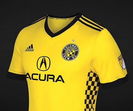 A Adidas estampa uma versão preta de sua logomarca no lado direito do peito, enquanto o escudo do Columbus Crew é colocado no lado esquerdo, em sua versão tradicional. A logomarca da MLS com as cores da equipe é colocada nas duas mangas.