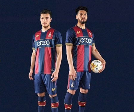 Completam o uniforme, calção azul marinho e meiões na cor azul marinha com uma faixa vermelha com contorno amarelo.