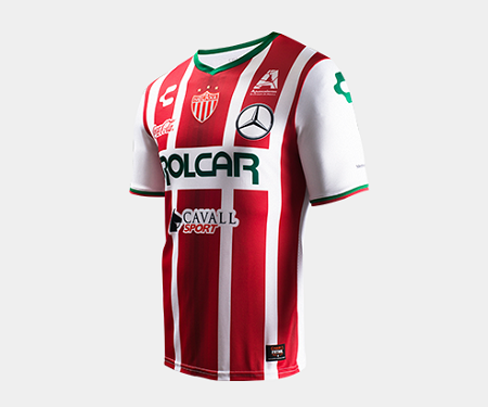 A Charly estampa versões brancas de sua logomarca nas mangas e no lado direito do peito, enquanto o escudo do Necaxa é colocado no centro do peito, em sua versão atual.