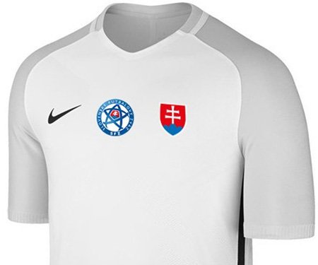 A Nike estampa uma versão branca de sua logomarca no lado direito do peito, enquanto o Brasão de armas da Eslováquia, presente na bandeira do país, é colocado no lado esquerdo, e a logo da Federação Eslovaca é colocada no meio.