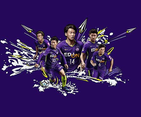 A camisa titular do Sanfrecce para a temporada é predominantemente roxa e traz diferentes tons da cor formadas por linhas diagonais que são divididas por faixas verticais.