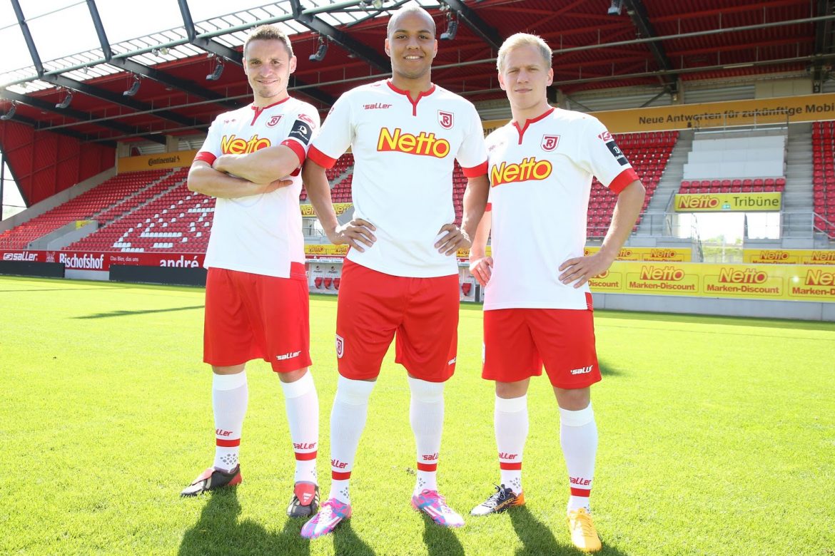 A Saller estampa uma versão vermelha de sua logomarca no lado direito do peito, enquanto o escudo do Jahn Regensburg é colocado no lado esquerdo, em sua versão atual padrão.