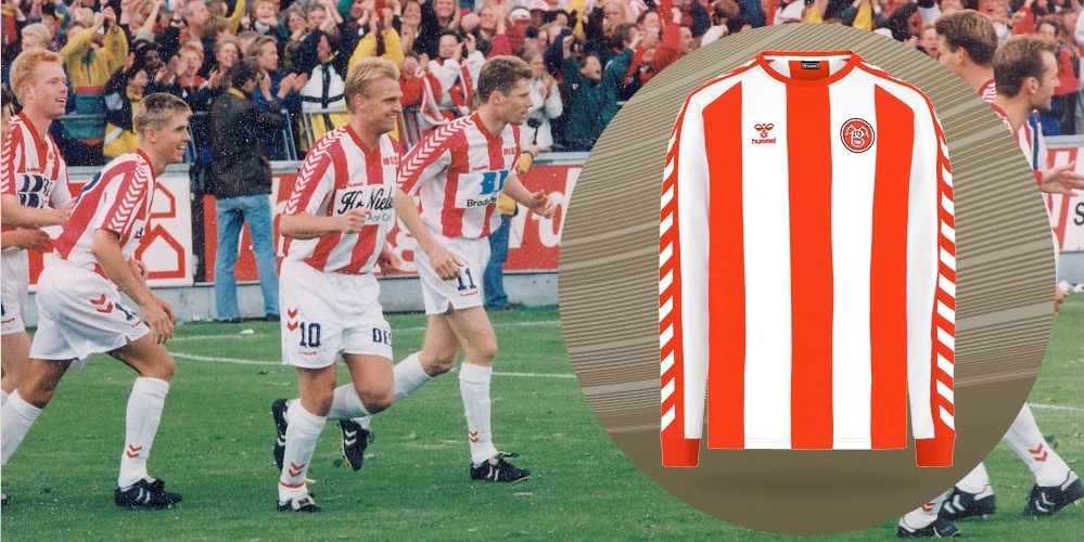 O manto retrô traz um design muito parecido com o de 25 anos atrás, que também era Hummel. Ele tem o branco como cor predominante e três listras verticais vermelhas na região frontal e das costas A cor volta a aparecer na gola redonda, punhos e em faixas nas mangas, onde são colocados os chevrons, em branco.