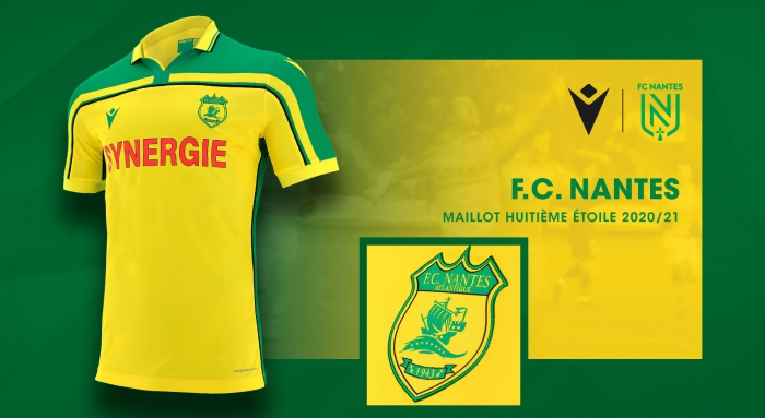 O logo da Macron é verde com o escudo do clube aplicado igual era usado na época, quando a equipe ainda era chamada FC Nantes Atlantique. Dentro é visto um navio com sete estrelas dentro, que indicavam o total de títulos do clube até então.