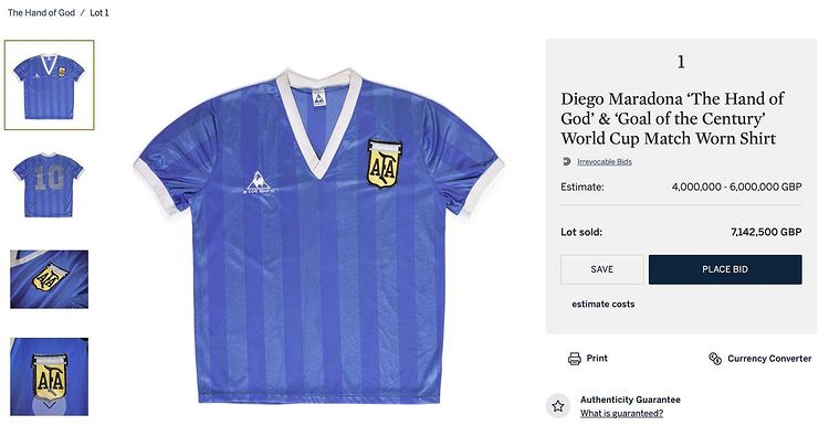 Terminou o leilão da histórica camisa utilizada por Maradona no duelo contra a Inglaterra, na Copa do Mundo de 1986, com direito a valor recorde: 7,14 milhões de libras (R$ 44,5 milhões), maior valor já pago por um uniforme esportivo em um leilão.