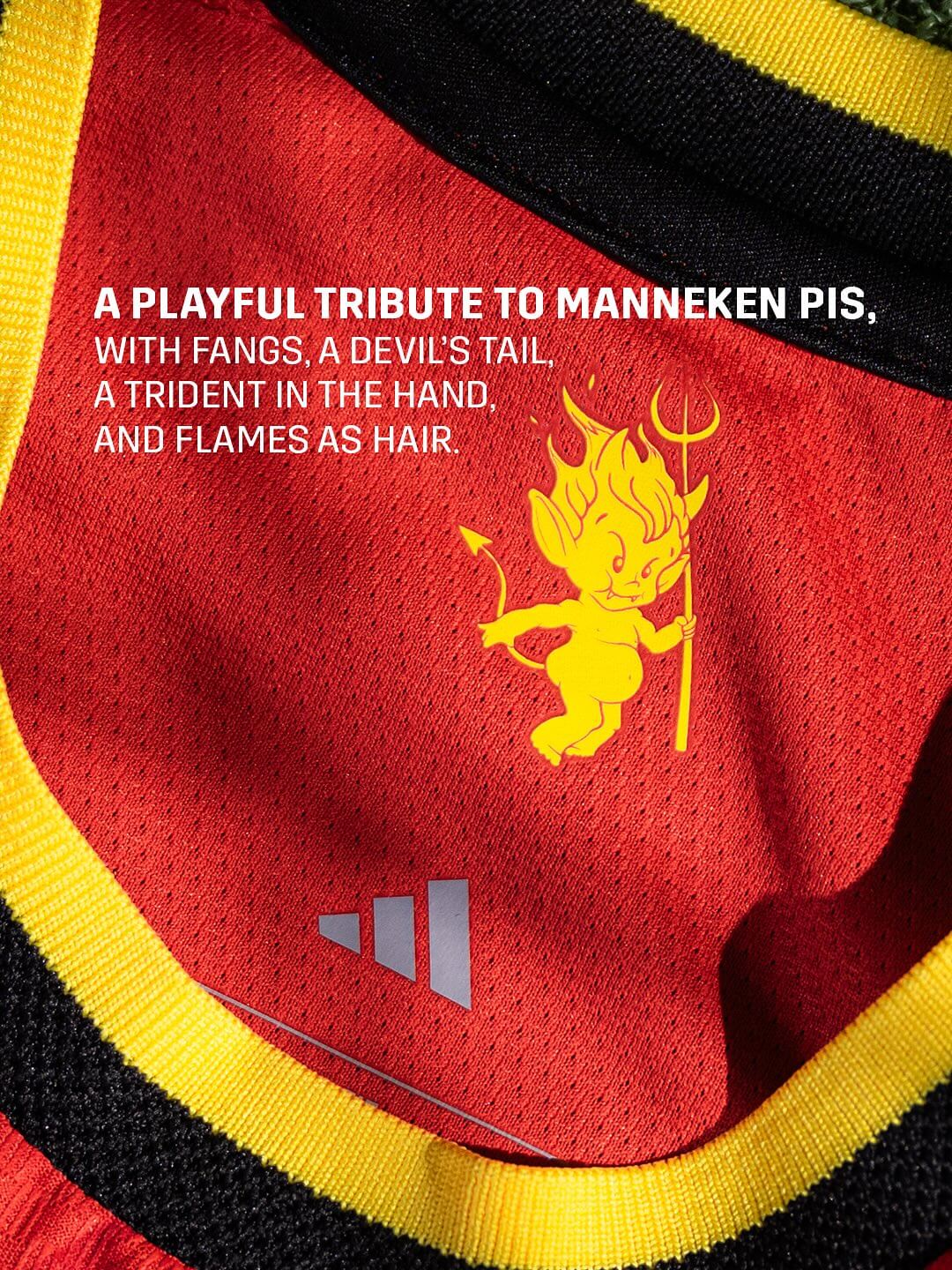 A gola de formato redondo e os punhos trazem um estilo raglan, em preto e amarelo, mesmo padrão visto no calção. Dentro da gola, é vista uma homenagem divertida ao Manneken Pis, ícone cultural de Bruxelas, retratado com presas, rabo diabólico, tridente em mãos e chamas como cabelo, um toque criativo que reforça a identidade única do futebol belga.