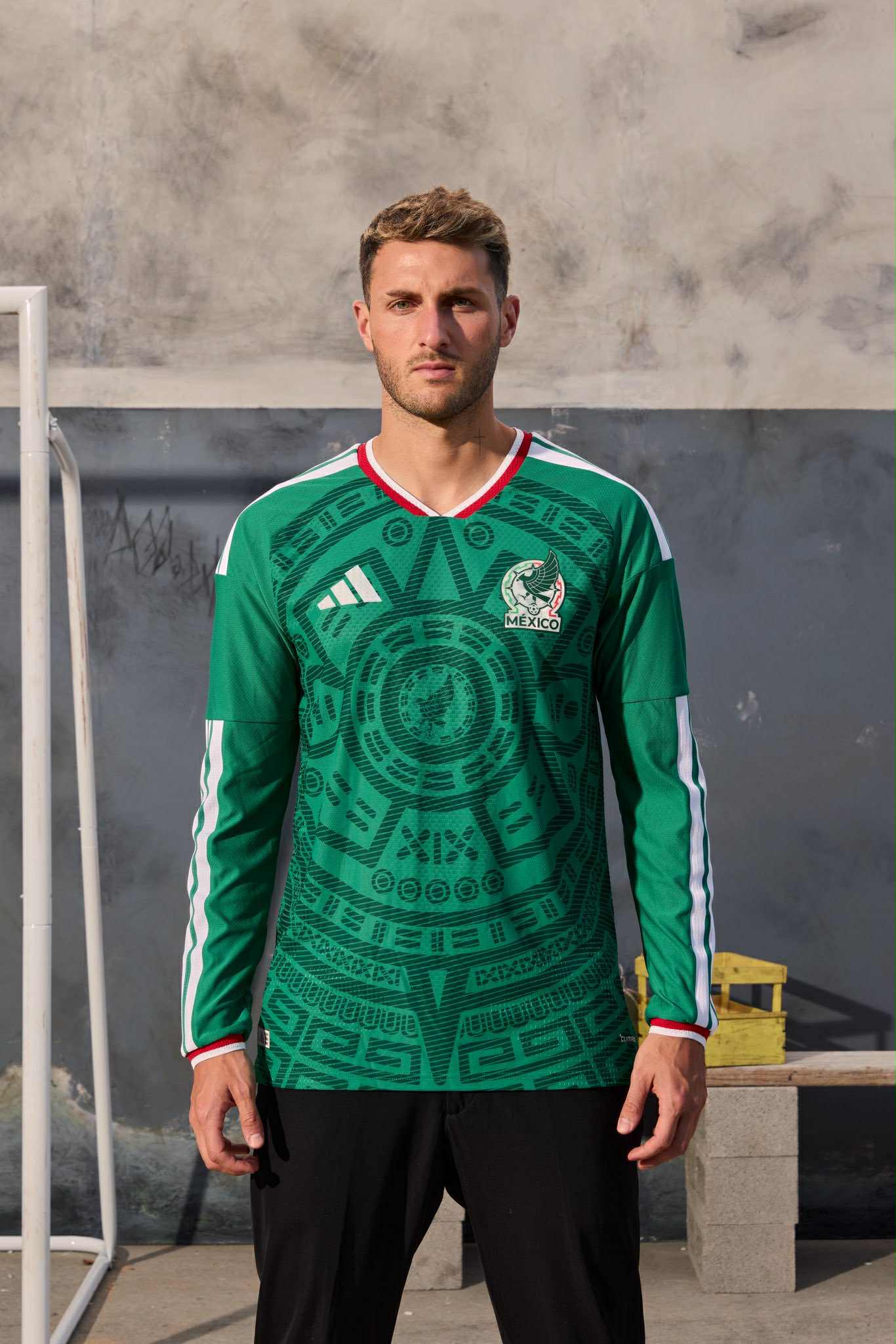 A camisa é verde e ganha linhas verdes escuras que trazem gráficos inspirados na cultura mexicana, com referência clara o uniforme usado na Copa de 1998. A gola é V na cor vermelha com bordas brancas, padrão que é visto também nos punhos. Nos ombros as três listras aparecem em branco, no estilo mais largo, que será a marca da fornecedora no Mundial.