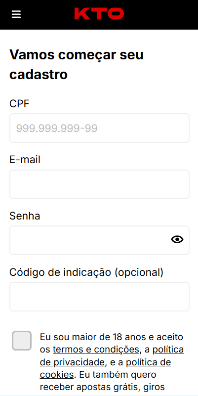 Para iniciar o processo de cadastro na KTO, clique em qualquer um dos nossos banners presentes neste artigo. Isso redirecionará você para a página oficial da casa de apostas.