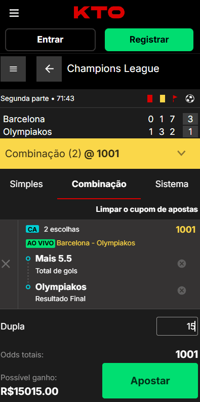 - Inserir os Valores: Insira o valor que deseja apostar em cada seleção e observe como as odds são atualizadas automaticamente para refletir o potencial retorno da aposta.